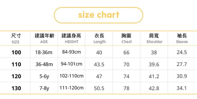1. 尺寸表單位皆為公分(cm),實際尺寸會因布料彈性、水洗、測量起迄點等因素略有誤差。建議參考孩子平時穿著衣物尺寸進行選購。