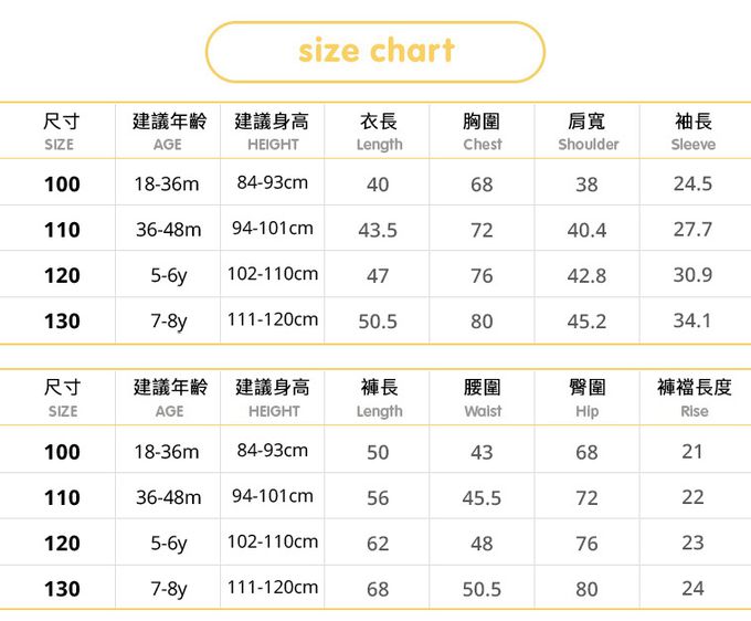 1. 尺寸表單位皆為公分(cm),實際尺寸會因布料彈性、水洗、測量起迄點等因素略有誤差。建議參考孩子平時穿著衣物尺寸進行選購。
