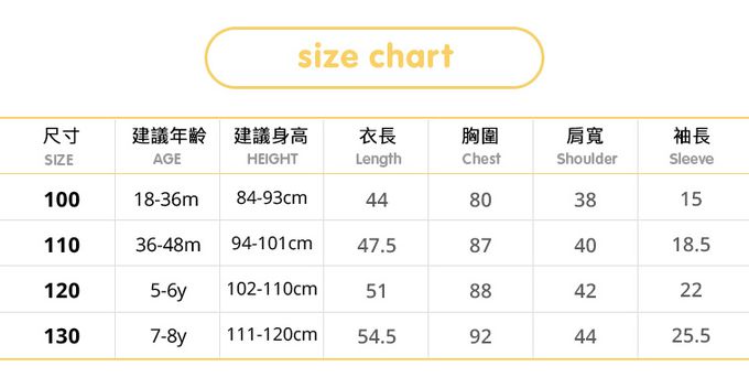1. 尺寸表單位皆為公分(cm),實際尺寸會因布料彈性、水洗、測量起迄點等因素略有誤差。建議參考孩子平時穿著衣物尺寸進行選購。