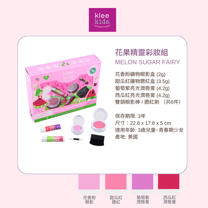 花果精靈彩妝組-花香粉礦物眼影盒(2g)+甜瓜紅礦物腮紅盒(3.5g)+葡萄紫亮光潤唇膏(4.2g)+西瓜紅亮光潤唇膏(4.2g)+雙頭眼影棒+腮紅刷(共6件)