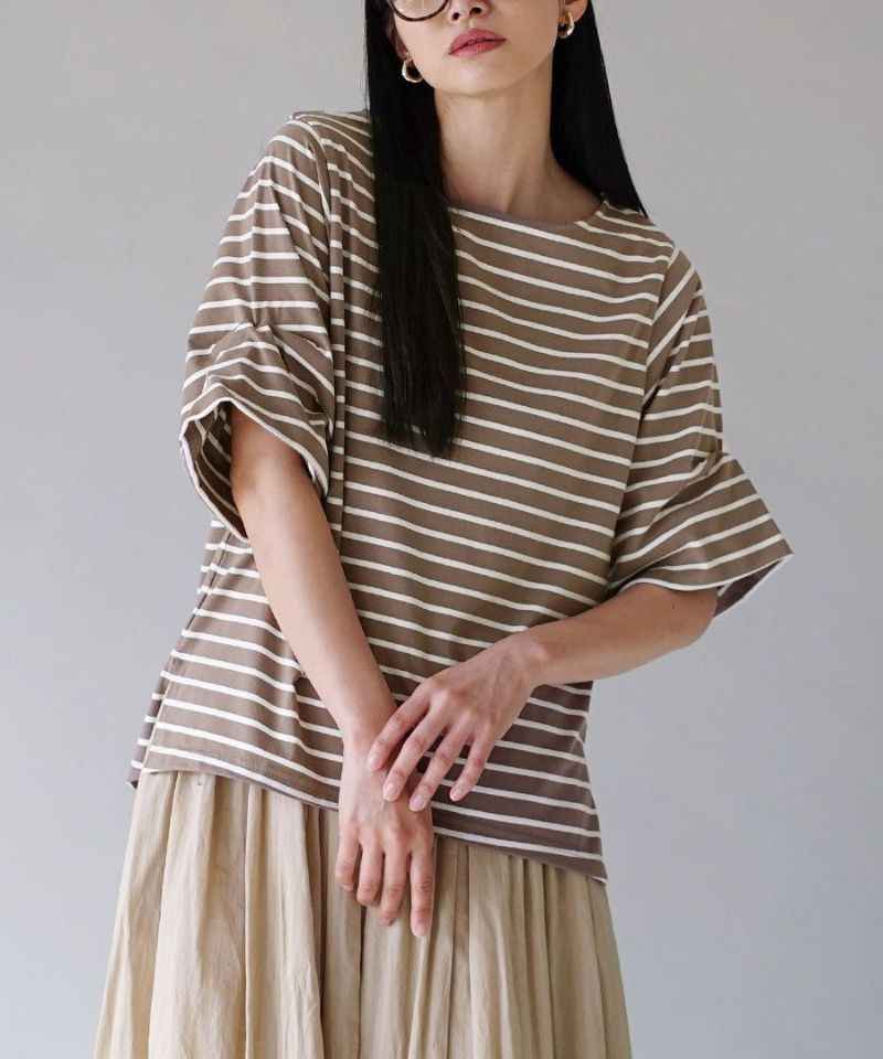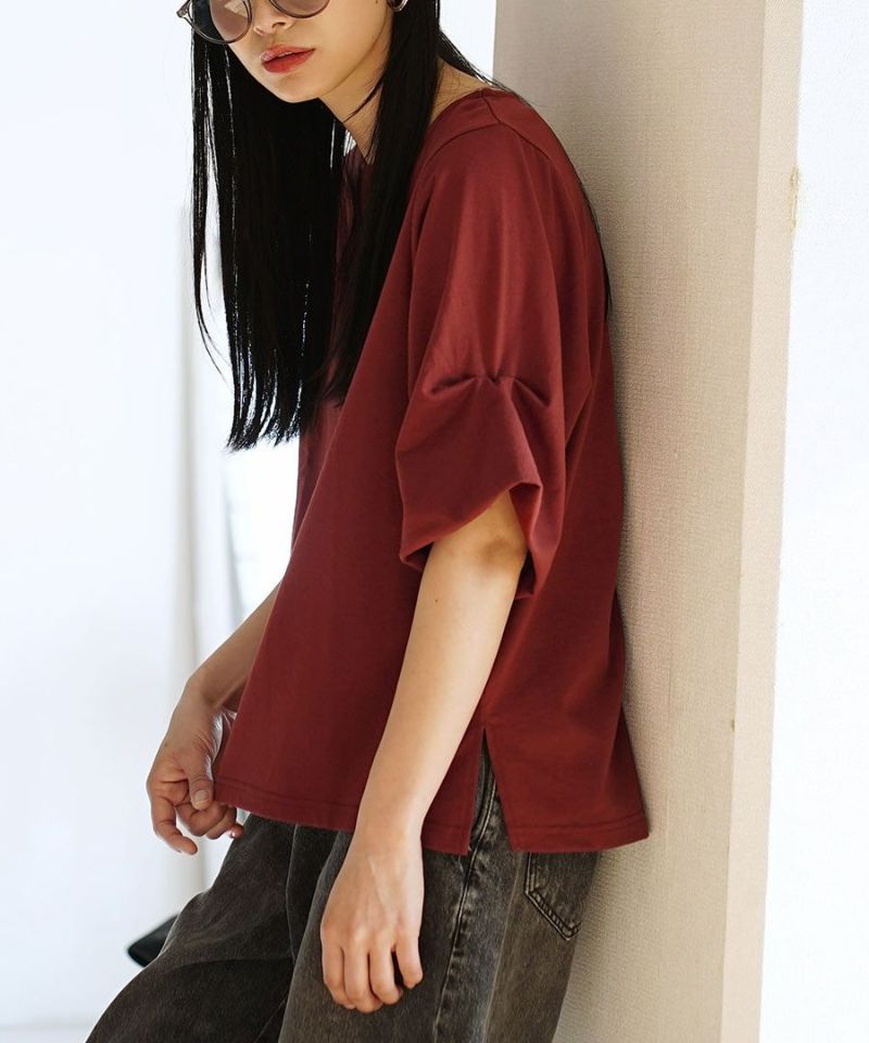 日本 zootie - 天竺棉混顯瘦抓皺五分袖上衣-圓領-暗紅