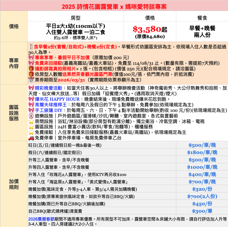 註:其他房型升等:因露營車空間、床鋪大小有限,雙人露營車建議2大1幼入住,四人露營車建議2大2小入住。(超過專案人數,建議加人升等3-4人房)升等3人露營車(含早/不含晚餐),加價$500/車/晚;升等4人露營車(含早/不含晚餐),加價$1000/車/晚。