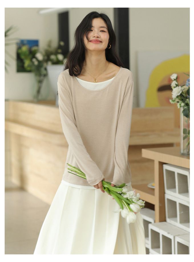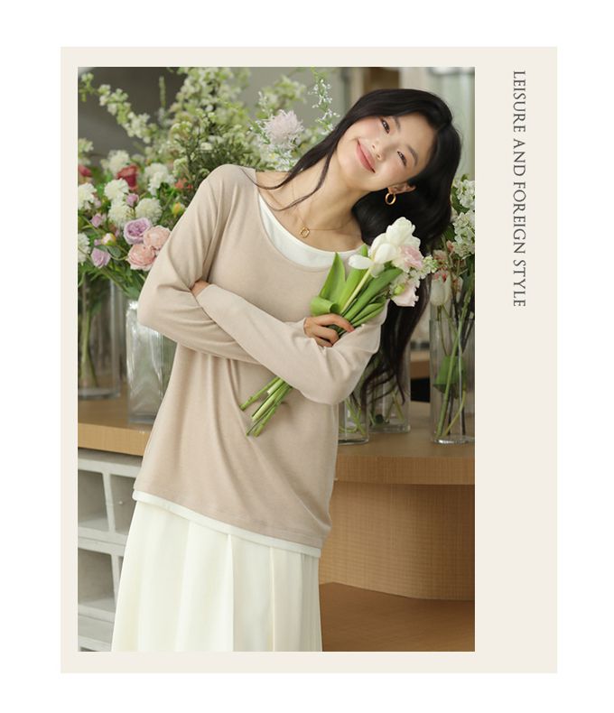 KPUWARM - 羊絨感假兩件長袖上衣-百搭駝 (F)