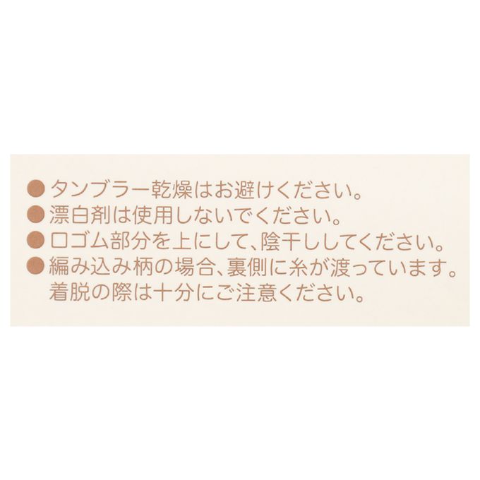 注意事項:●標示內容遵照台灣法規之規定。●請將襪口朝上,在陰涼處晾乾。●有編織圖案的款式,其紗線會編織到襪子內側。穿脫時請小心注意。