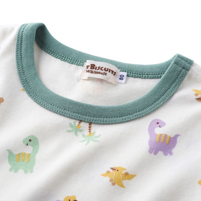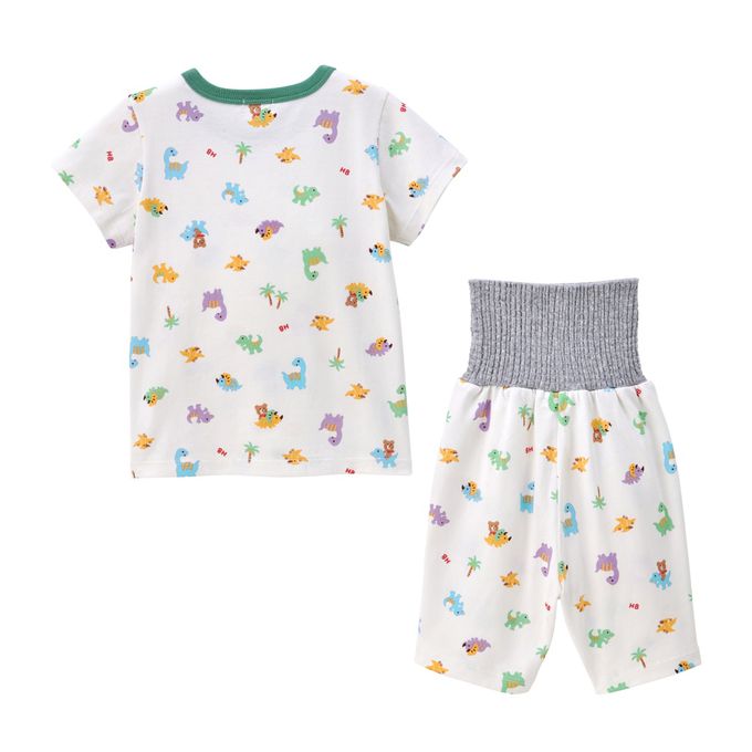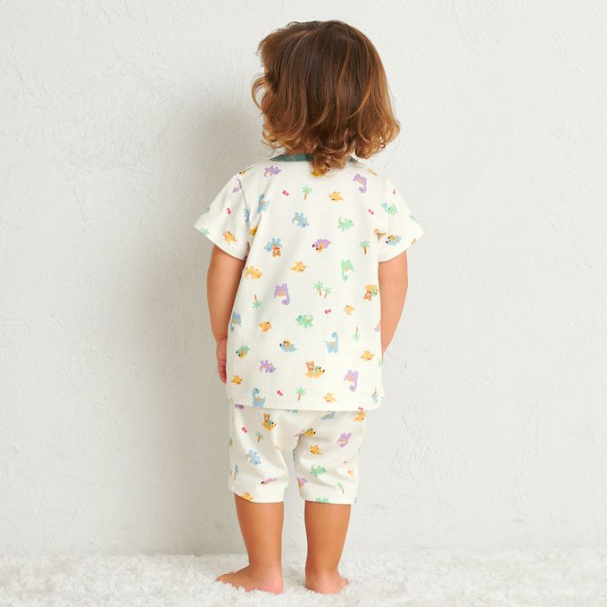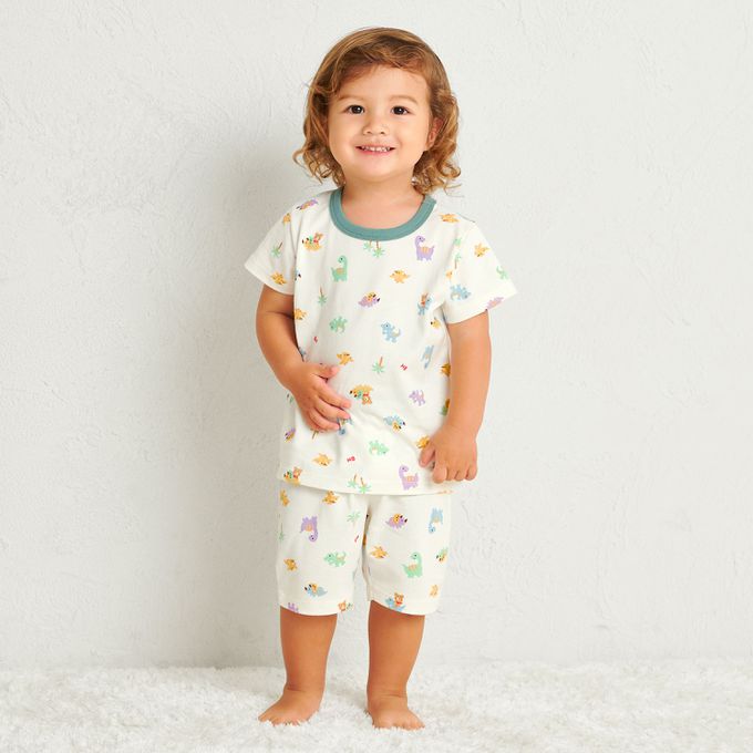 短袖上衣搭配6分褲的夏季家居服,印有小熊Beans×幼童喜愛的恐龍圖案,色彩繽紛又帥氣。