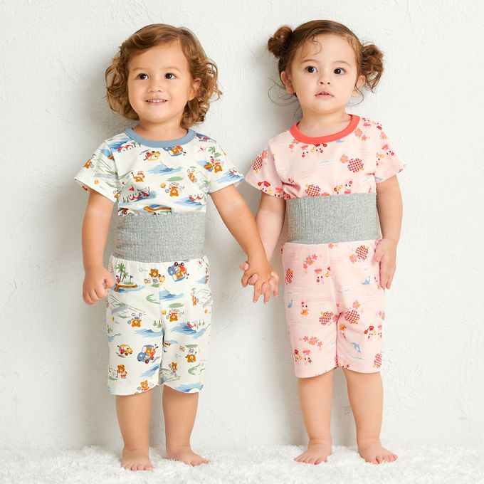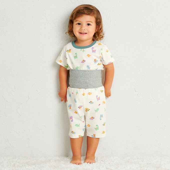 為防止小肚肚露出著涼,褲子採用附肚圍的一體化設計,即使夏天在冷氣房裡也很放心。