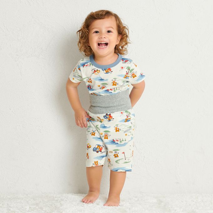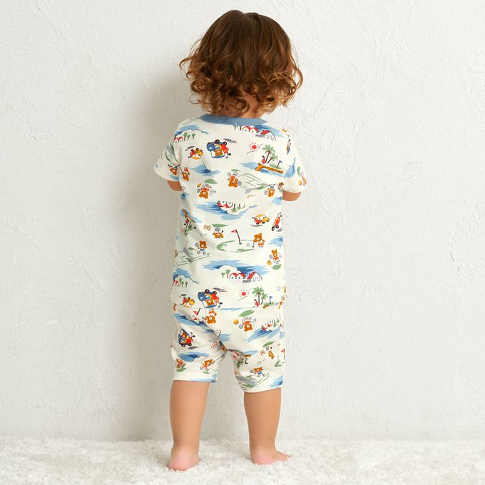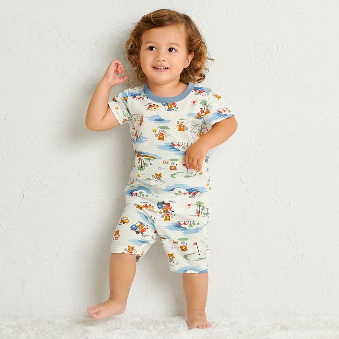 短袖上衣搭配6分褲的夏季家居服,印有小熊Beans在度假勝地打網球和高爾夫的圖案,展現出夏日的清新風格。