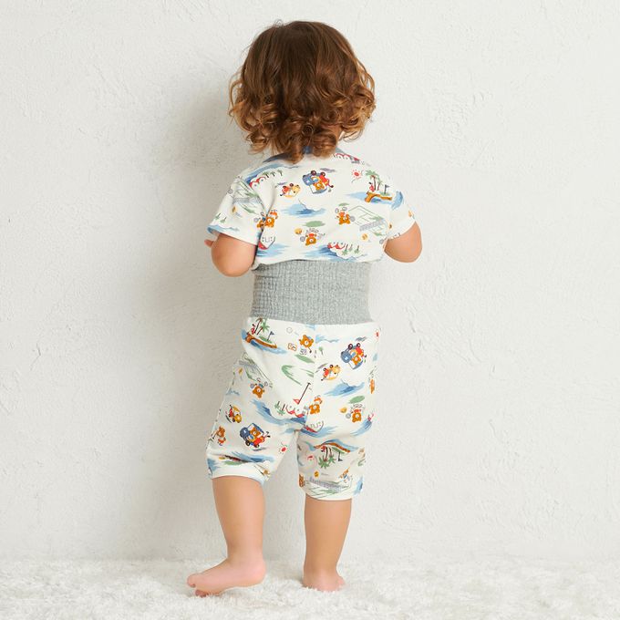 為防止小肚肚露出著涼,褲子採用附肚圍的一體化設計,即使夏天在冷氣房裡也很放心。