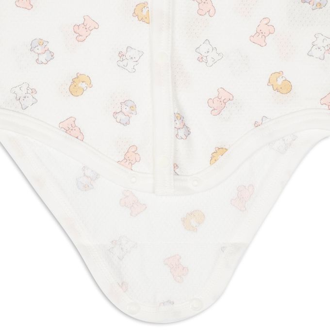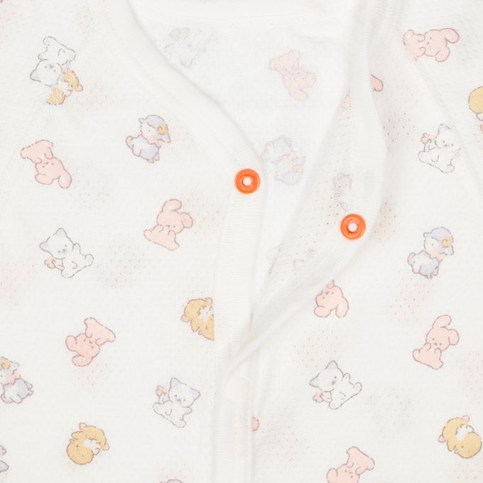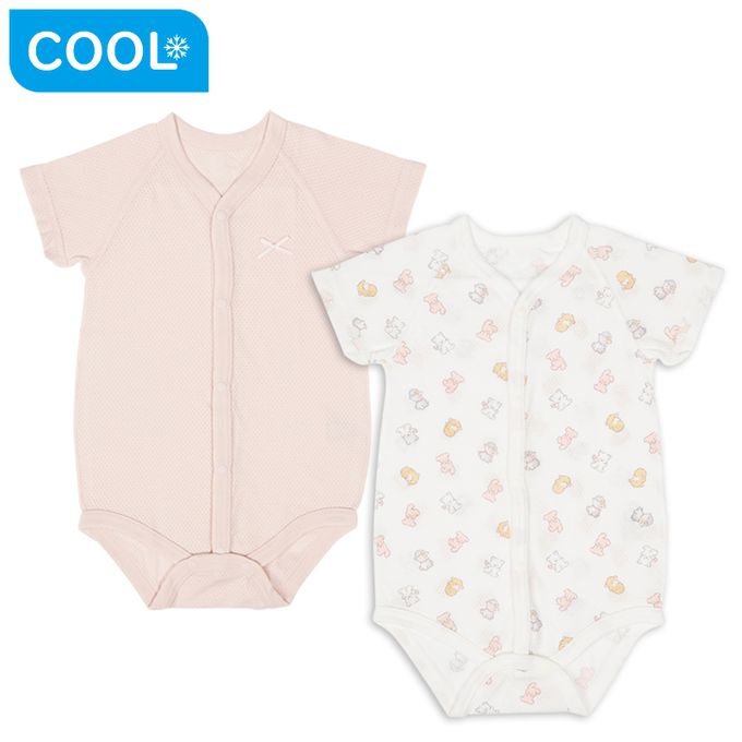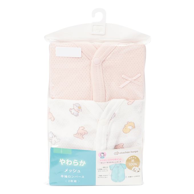 akachan honpo - 短袖網眼包屁衣2件組-前開式 點點 動物-粉紅色