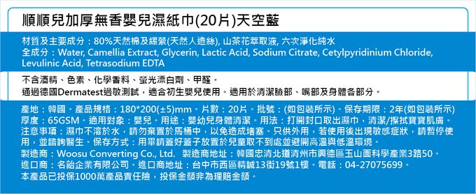 注意事項:注意事項:濕巾不溶於水,請勿棄置於馬桶中,以免造成堵塞。只供外用,若使用後出現敏感症狀,請暫停使用,並諮詢醫生。保存方式:用畢請蓋好蓋子放置於兒童取不到處,並避開高溫與低溫環境。