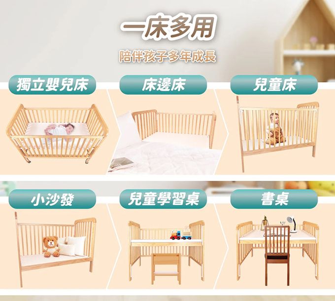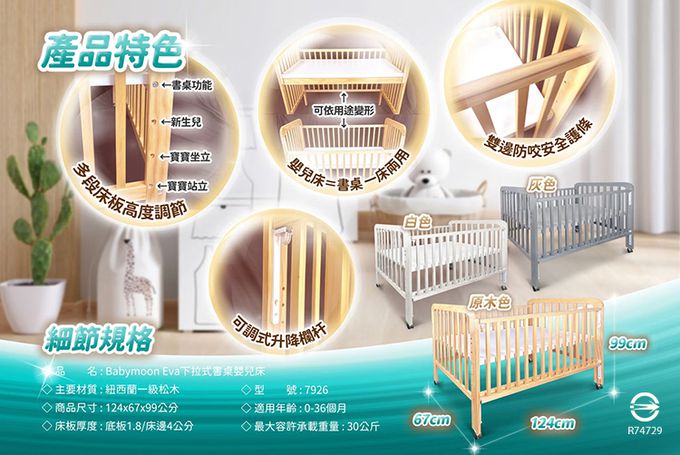 注意事項:【商品規格】 適用年齡:0-36個月 最大承重:30kg 主要材質:紐西蘭一級松木 商品尺寸:約 124x67x99cm 床板厚度:底板1.8cm / 床邊4cm 產地:台灣 商品檢驗標識號:R74729 【注意事項】 ● 使用方法:內附六角板手工具需自行安裝詳情請看說明書。 ● 收納或調整嬰兒床時,應將嬰兒抱開。 ● 不得讓嬰幼兒在無成人監督的情況下單獨使用。 ● 如果寶寶不慎跌落或者昏迷,立即撥打119。 ● 應遠離火源。 ● 使用時應固定腳輪。 ● 使用前應確實固定各機件以確保安全。 ● 嬰兒床不得裝設繩子或容易脫落之危險物。 ● 嬰兒床之內側及外側四周不得放置嬰兒可踏上或抓起之物品。 ● 當嬰兒能抓住站立時,床板上面至上橫桿之高度須調整至60公分以上。 ● 嬰兒床應放置在平坦之地面上,且其附近不得使用火爐、電爐等危險物。