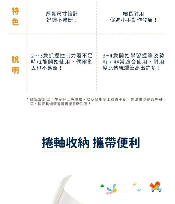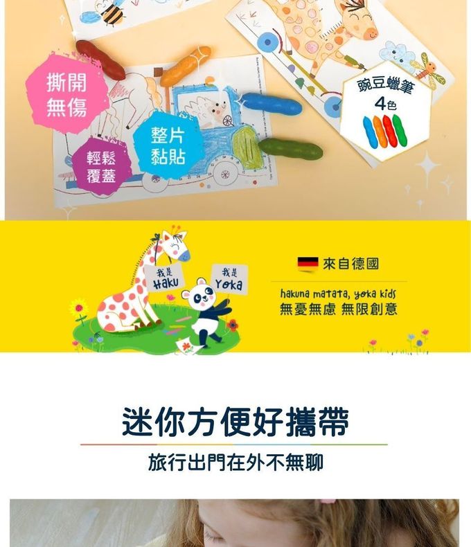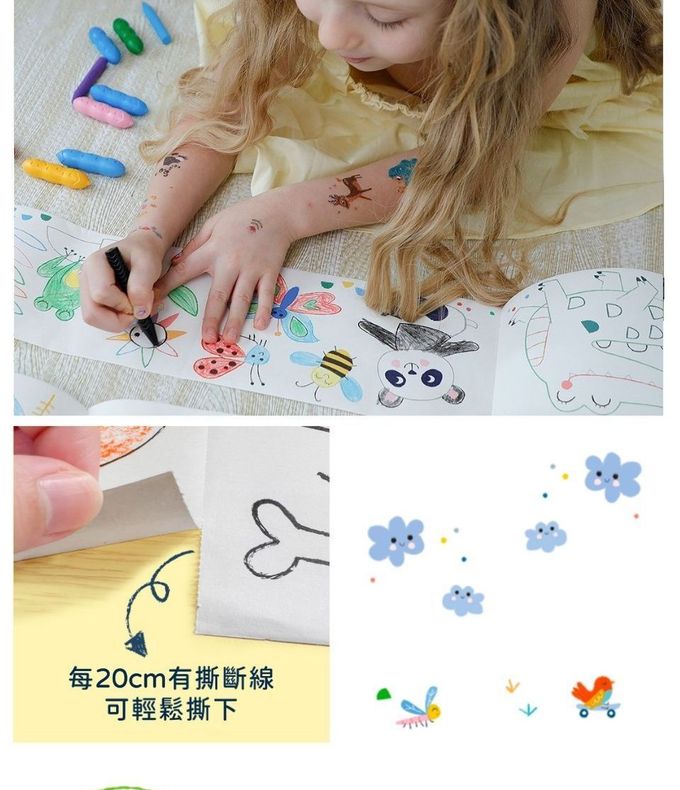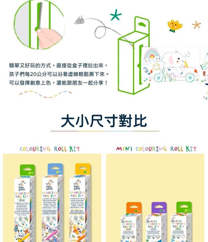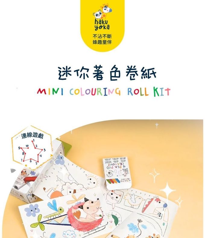孩子愛在不同地方畫畫,但傳統的畫紙有限,而且貼上牆面或桌面很容易破壞表面。Haku Yoka 的迷你著色捲紙,小巧好攜帶,可直接從盒中拉取,收納方便,讓孩子隨時隨地發揮創意。內附4色無毒不沾手天然蜂蠟碗豆蠟筆。