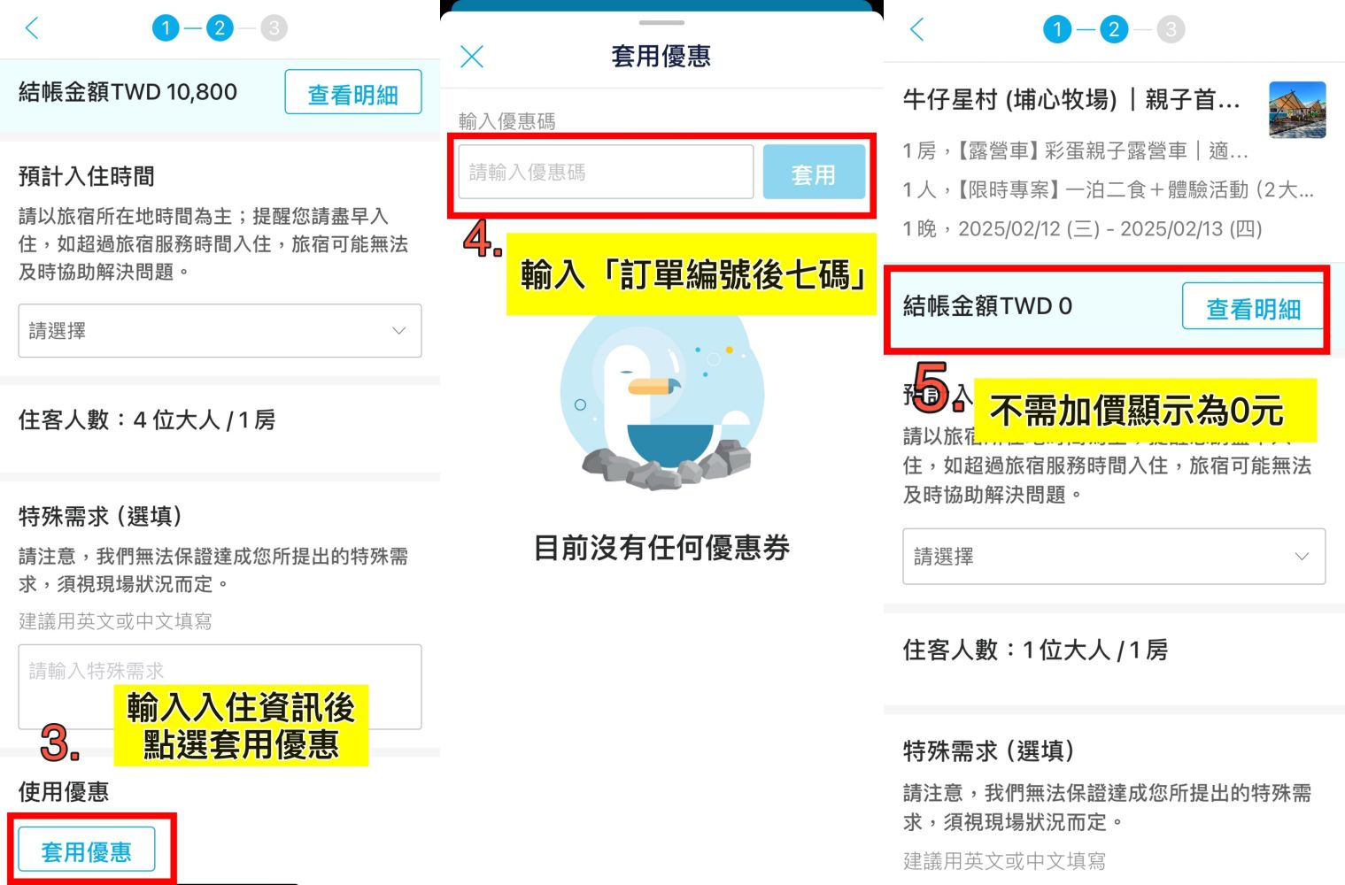 ※ 步驟4 依步驟選擇入住日期及人數→ 於付款前點選「套用優惠」並於輸入優惠碼欄位填寫【 媽咪愛訂單編號後七碼 】→ 點選「套用」即可依本專案優惠結帳並完成訂房。
