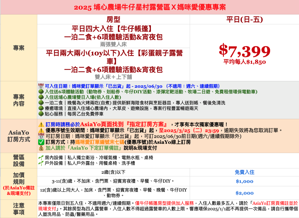 註:本專案為「平日(日-五)入住牛仔帳篷(四大)或彩蛋親子露營車(限兩大兩小,10歲以下)一泊二食」,專案贈送6項體驗活動&宵夜包。
