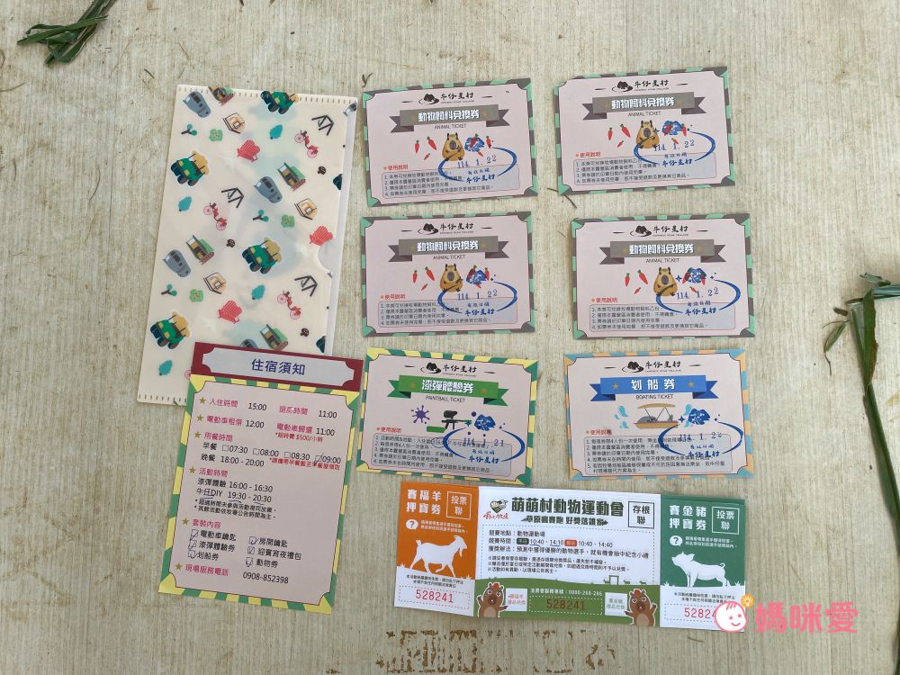 如果要說整趟旅程最燒腦的環節,應該就是Check-in了,因為有超~多~東西要記住!這裡的活動超級豐富,每個體驗都有指定時段,稍微安排一下才能玩得更順!報到時除了領取房門鑰匙和電動車鑰匙、確認隔日早餐時間,還會拿到一大疊體驗券,包括:動物互動券、漆彈定靶射擊體驗券、腳踩天鵝船券、 賽福羊/賽金豬押寶券、迎賓&宵夜禮包、早餐券,當下真的眼花撩亂,差點懷疑自己是不是報名了夏令營!