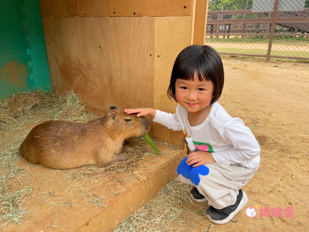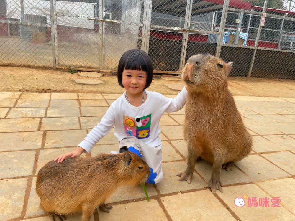 柳橙最喜歡的還是水豚,水豚超悠哉,懶洋洋地趴在地上,等著大家來餵牠,不會搶食,動作又慢,對小朋友來說是最友善的餵食對象。所以大家都圍著水豚,除了餵食,還能拍到超多可愛的照片,確實是這區人氣最高的動物之一!