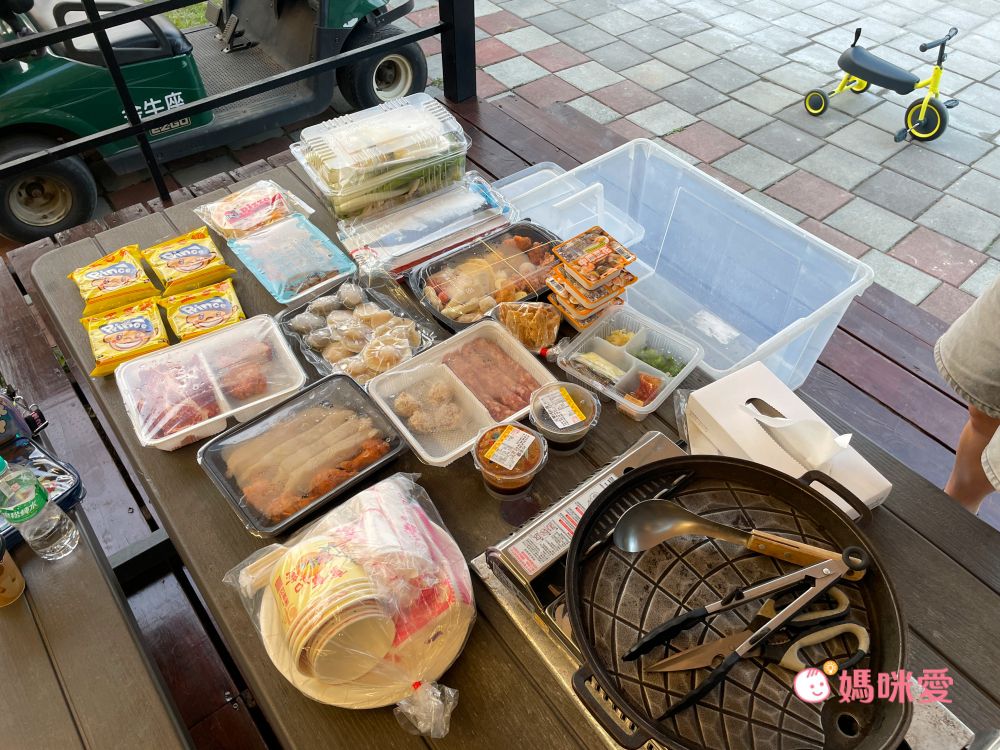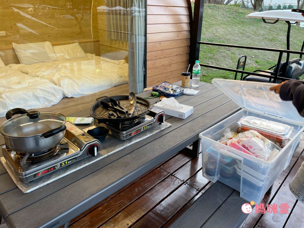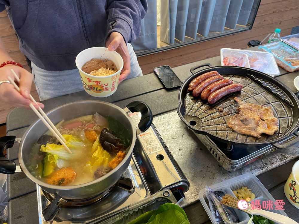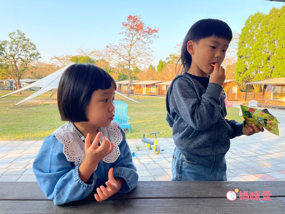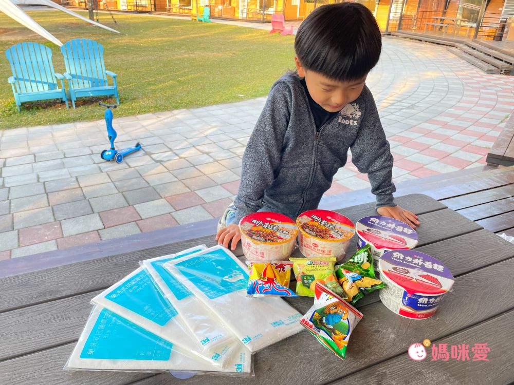 吃飽後,兩個小屁孩終於徹底斷電,早早進房倒頭就睡。夜晚的園區涼涼的,孩子睡了,這才是大人真正的放鬆時刻。最後,園區有提供冰箱、飲水機、微波爐,所以我們就在露台邊聊天、邊喝點小酒,享受難得的寧靜大人時光。沒有吵鬧的聲音,只有微風跟星空,這種時候才有度假的感覺啊!而原本安排的「夜間DIY體驗」和「宵夜禮包」,完全沒用到,宵夜禮包的泡麵也根本吃不下,但是餅乾下午已經被兩位朋友吃光了,所以泡麵就外帶回家當戰利品!