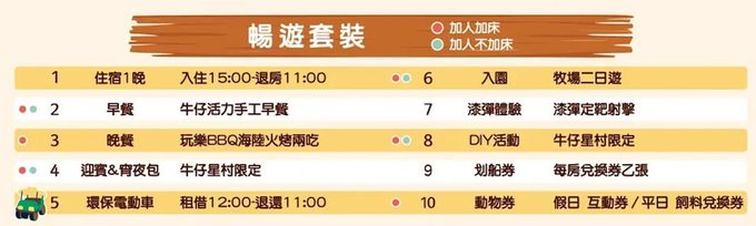 ■ 12(含)歲以上同大人收費NT$2000,加床,含門票、迎賓宵夜禮、早餐、晚餐、牛仔DIY、動物券。