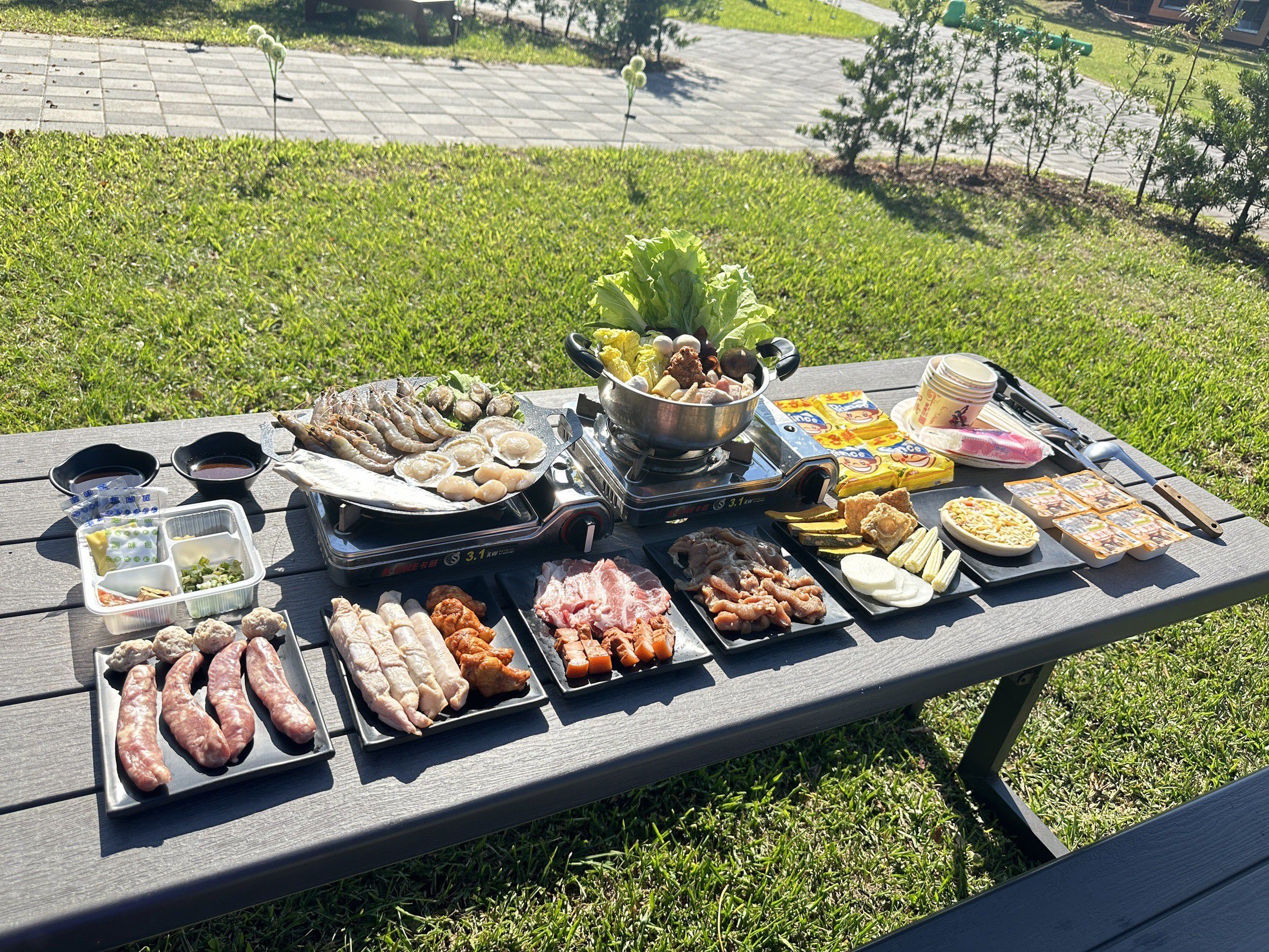 晚餐是火烤兩吃,工作人員會把瓦斯爐、烤盤、鍋具,還有一大箱食材直接送到房外,讓我們自己動手開烤!