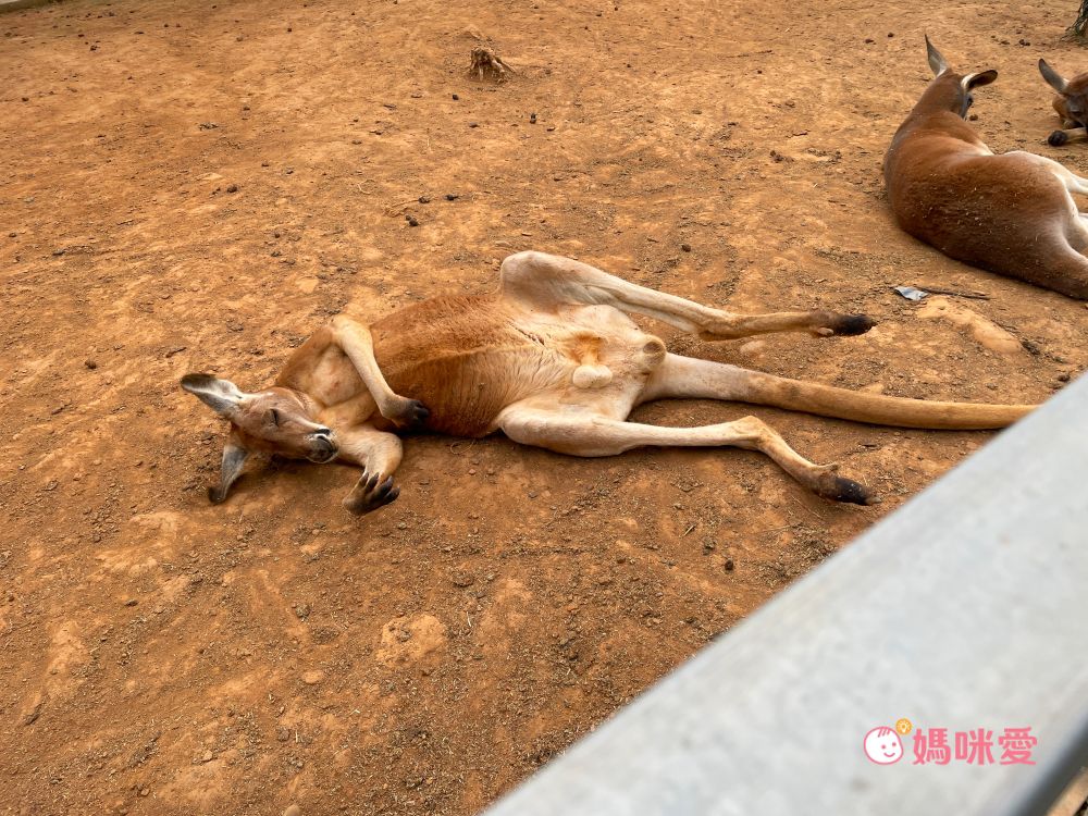 光是餵萌萌村的動物就花了不少時間,小朋友一刻不得閒,整個餵到停不下來!這裡能夠近距離接觸動物,確實很有趣。除了可以親手餵食,柵欄內還有梅花鹿、山羊、孔雀、袋鼠、豬等各種動物,可以很近地觀察牠們,而且袋鼠躺在地板上睡覺真的超像喝醉倒地,超級可愛!