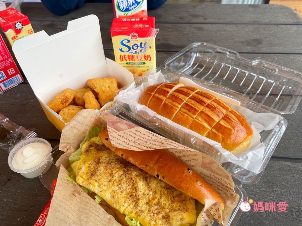 這早餐是現場製作的,種類也蠻豐富的,有軟法堡、捲餅、雞塊,搭配豆漿和蘋果汁,簡單但吃起來很剛好。
