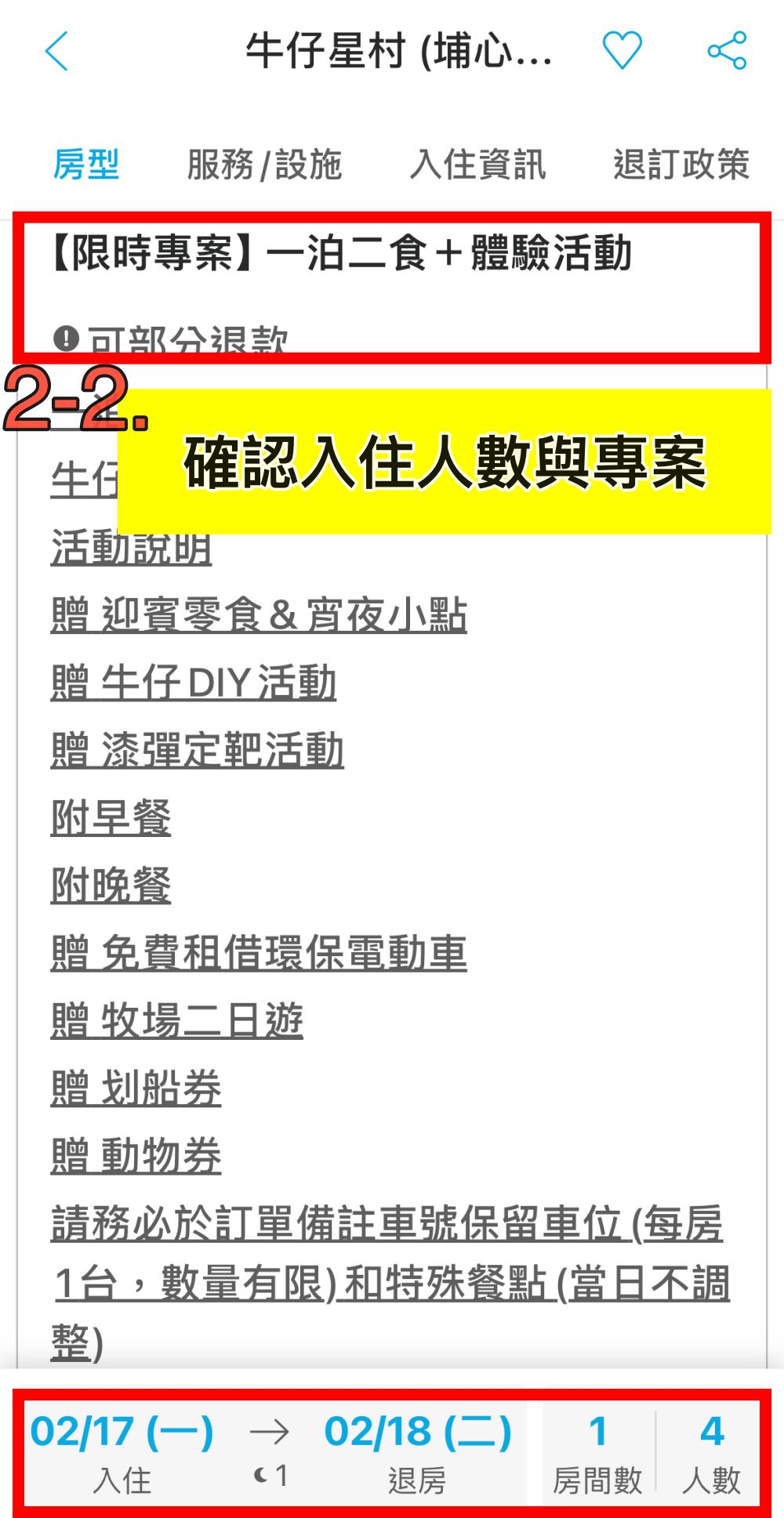 註:加人加價:2歲(含)以下免費入住。3-11(含)歲,不加床,含門票、迎賓宵夜禮、早餐、牛仔DIY,加價$1000;12(含)歲以上同大人,加床,含門票、迎賓宵夜禮、早餐、晚餐、牛仔DIY、動物券,加價$2000。