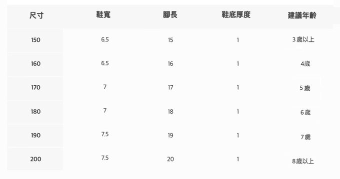 2. 每個尺寸的建議年齡、建議身高僅供參考,每位孩子發育狀況各有不同,建議參考寶貝現有的鞋子尺寸做對照。