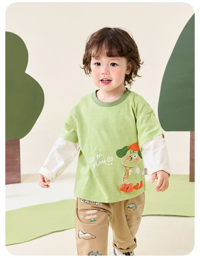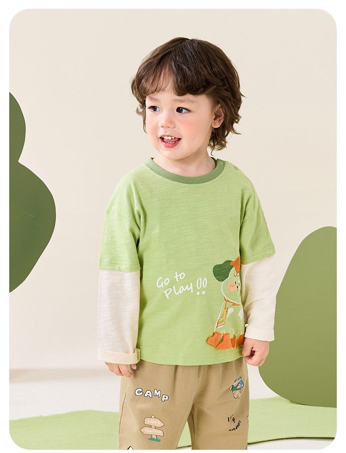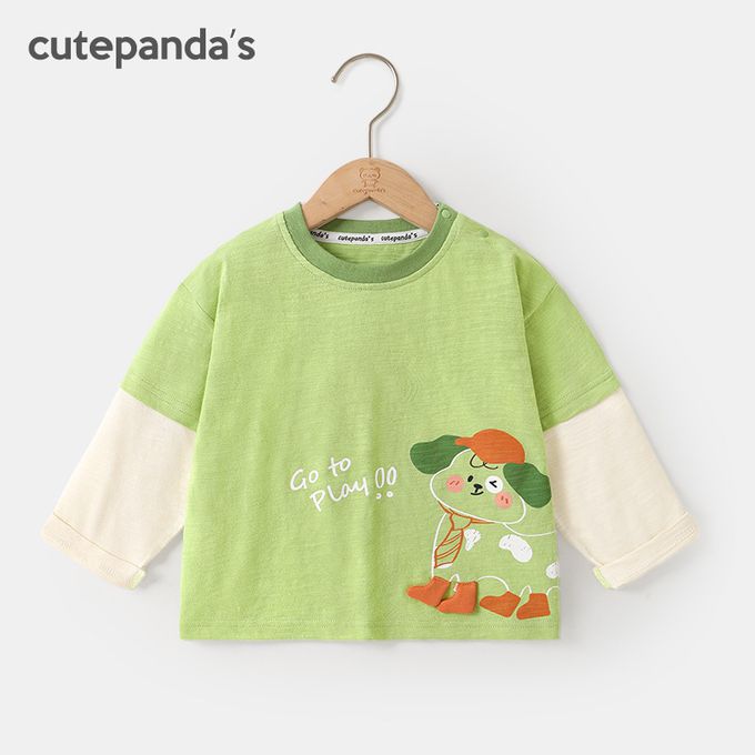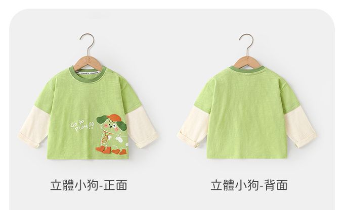 純棉圓領假兩件長袖上衣-立體小狗-綠色
