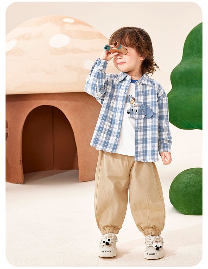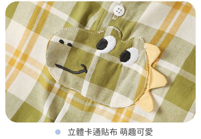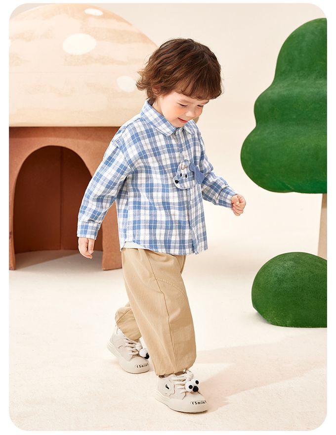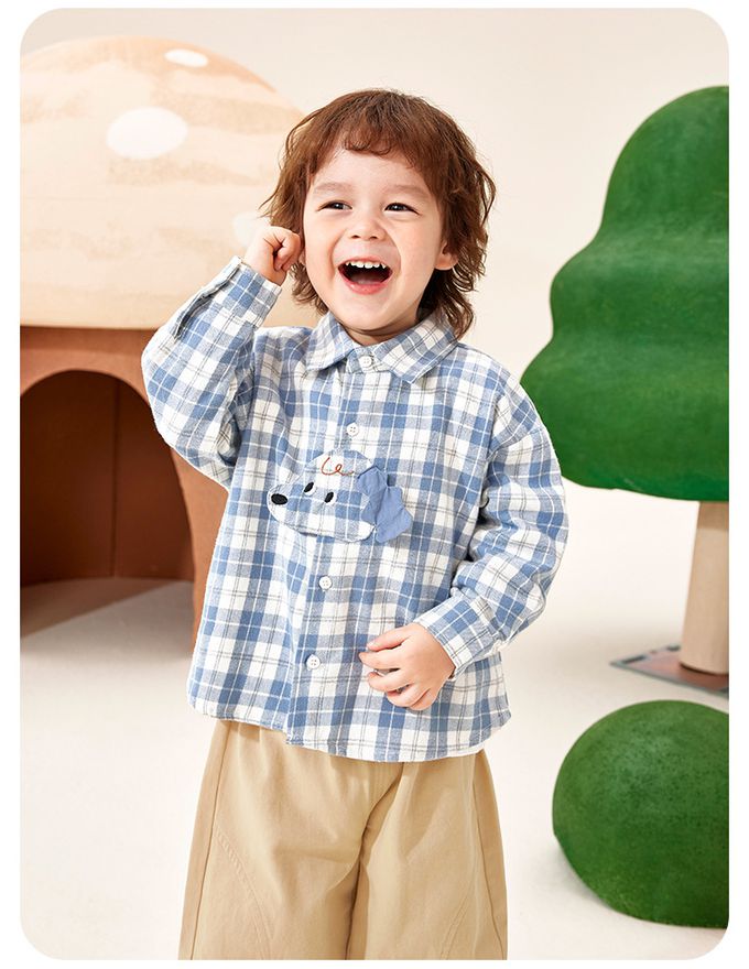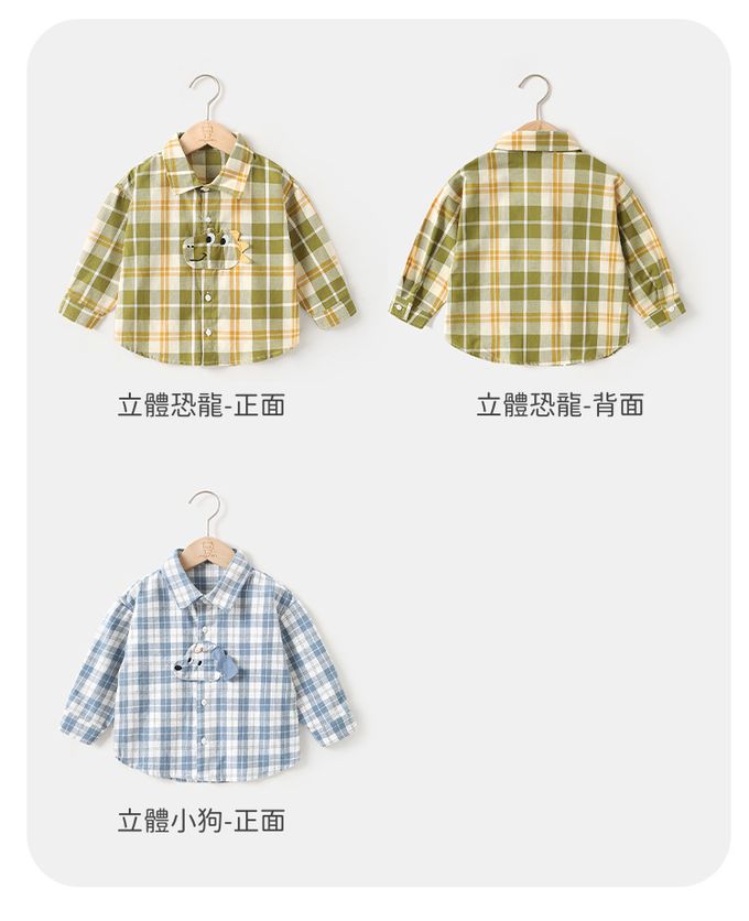 純棉格紋長袖襯衫-立體小狗-藍白色
