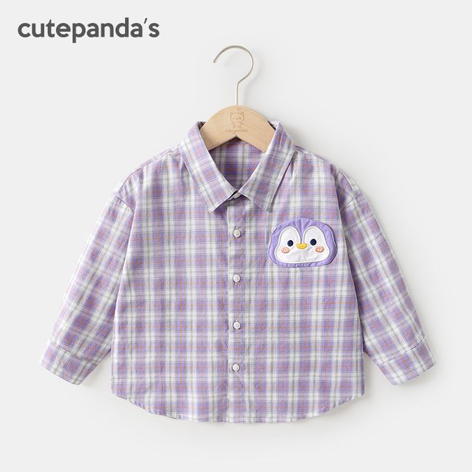 休閒百搭長袖襯衫-小企鵝-白紫格紋