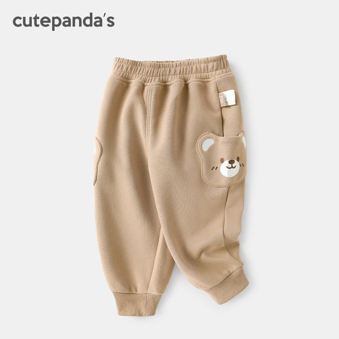 腰鬆緊運動休閒長褲-萌趣小熊口袋-奶咖色
