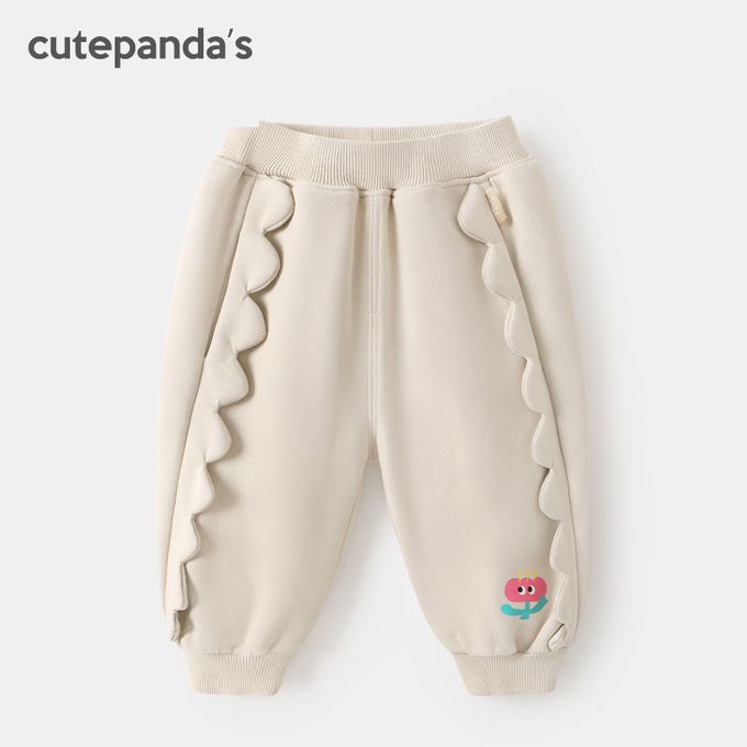 腰鬆緊運動休閒長褲-立體花邊-米杏色