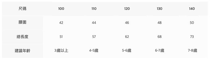2. 平均尺寸表乃參考平均值制定,每位孩童成長速度略有不同,請參考孩子實際體型、現有衣物尺寸等實際測量結果進行選購。