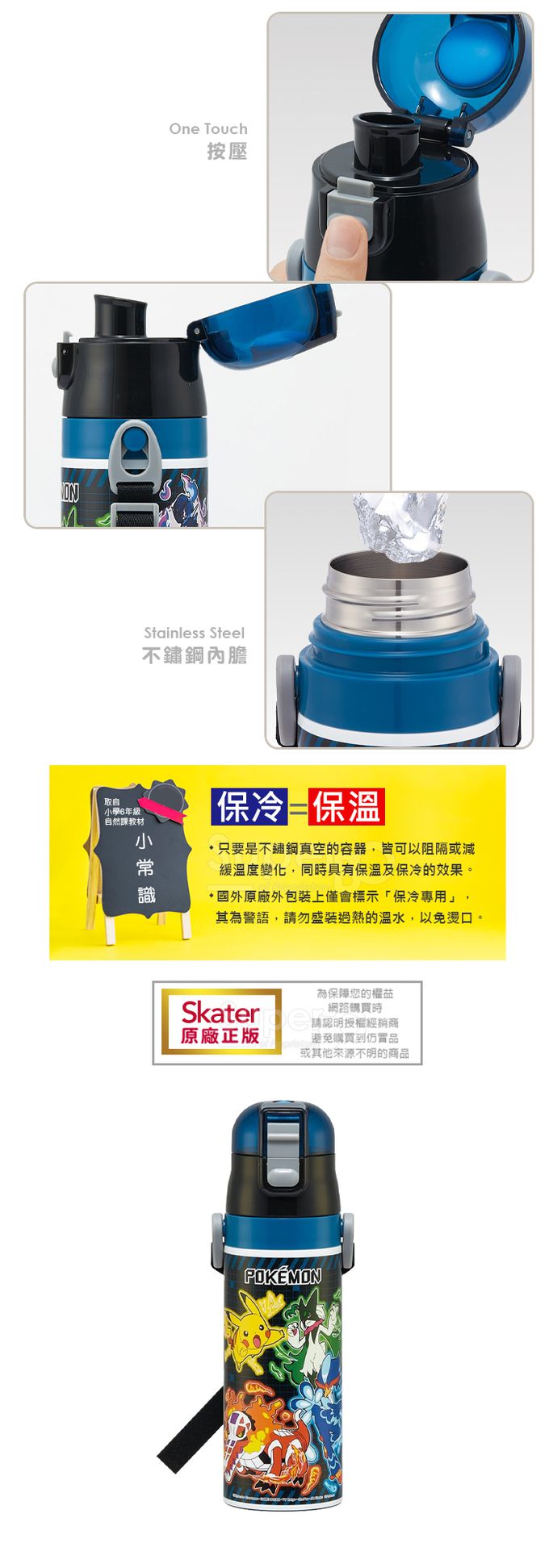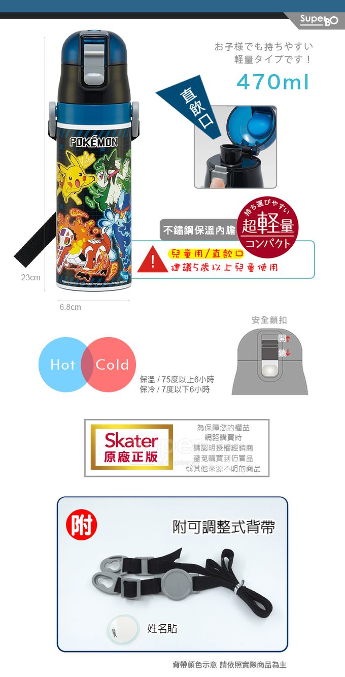 日本 SKATER - (兒童)不鏽鋼直飲保溫水壺-寶可夢-藍黑-470ml