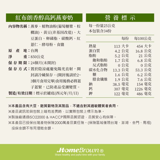 成分:燕麥、植物油粉(葡萄糖漿、棕櫚油)、黃豆(非基因改造)、大豆蛋白、卵磷脂、碳酸鈣、紅薏仁、酵母粉、食鹽