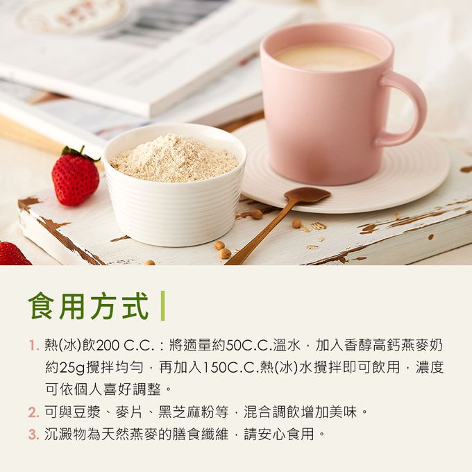 使用方式:1.熱(冰)飲200 C.C.:將適量約50C.C.溫水,加入香醇高鈣燕麥奶約3~5匙攪拌均勻,再加入150C.C.熱(冰)水攪拌即可飲用,濃度可依個人喜好調整。 2.可與豆漿、麥片….等,混合調飲增加美味。