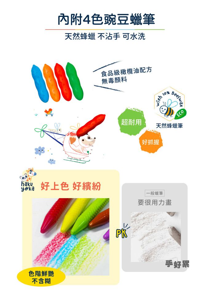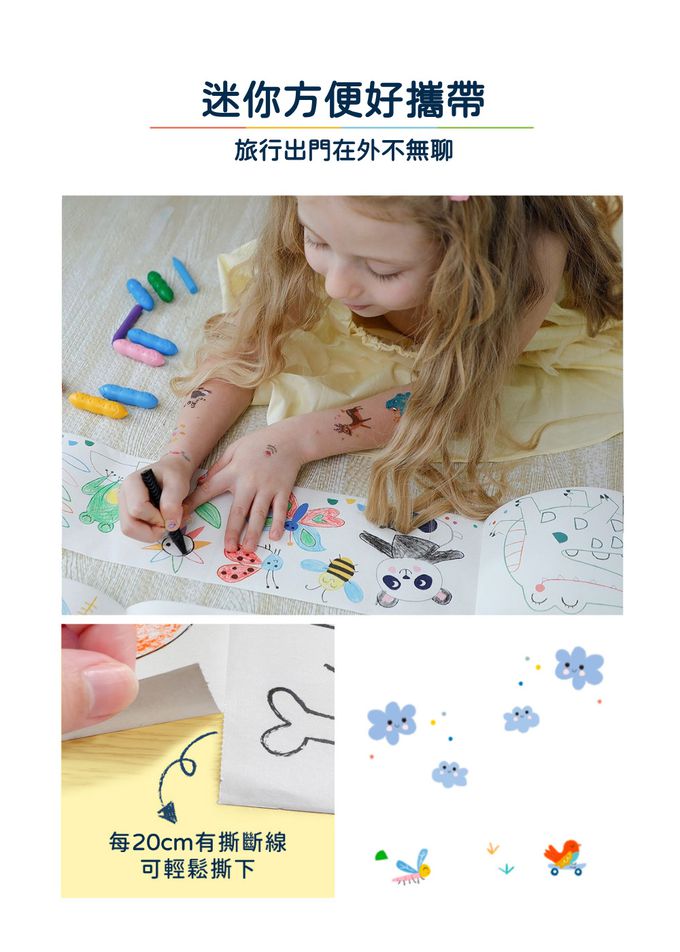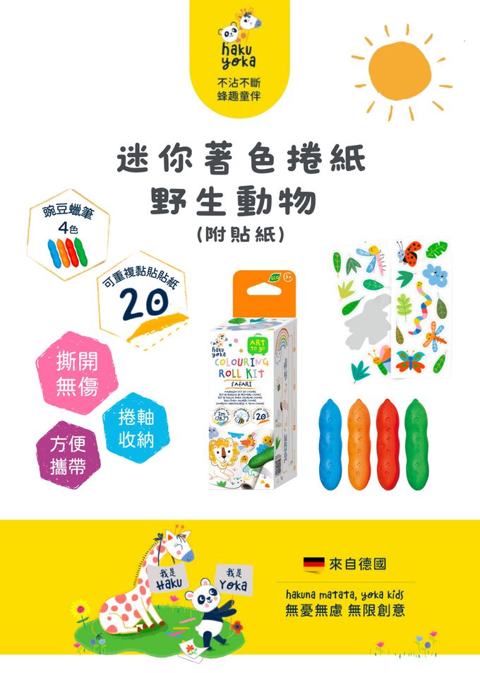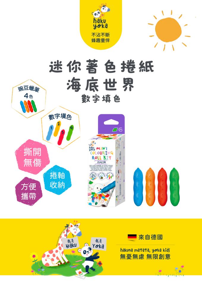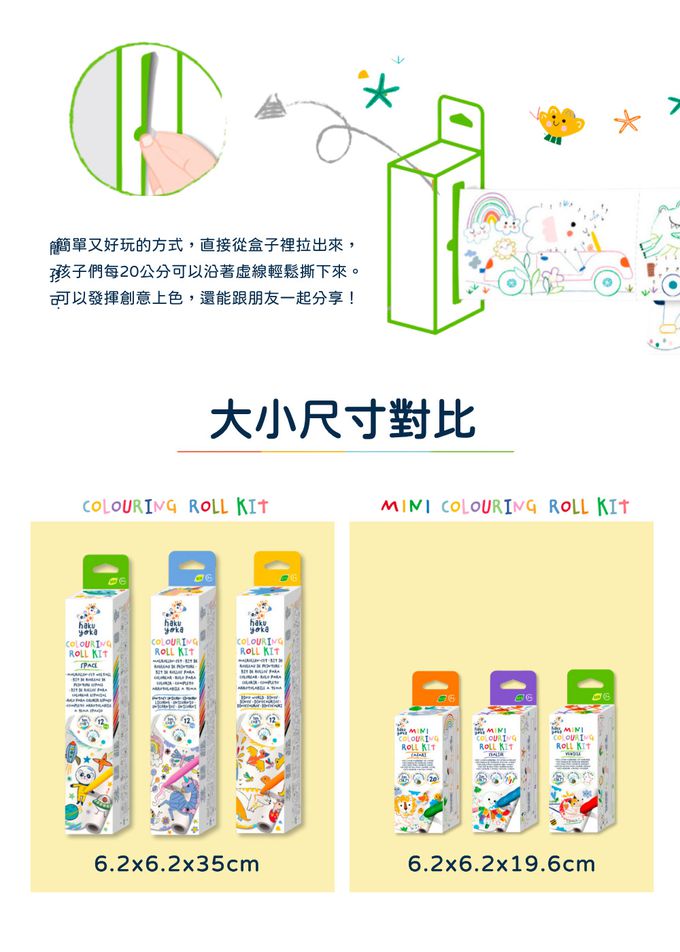 孩子愛在不同地方畫畫,但傳統的畫紙有限,而且貼上牆面或桌面很容易破壞表面。Haku Yoka 的迷你著色捲紙,小巧好攜帶,可直接從盒中拉取,收納方便,讓孩子隨時隨地發揮創意。內附4色無毒不沾手天然蜂蠟碗豆蠟筆。