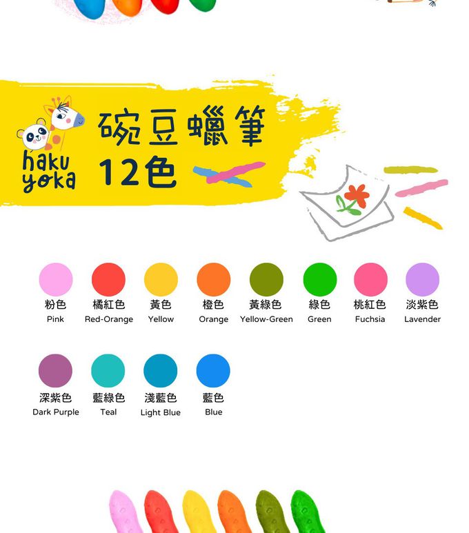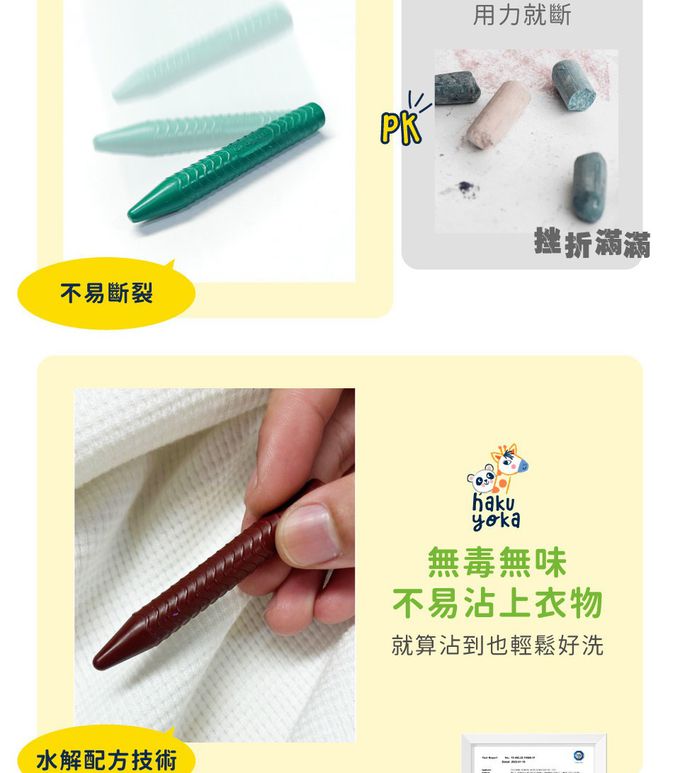 Haku Yoka 的每一個產品都經過精心設計,以誘發創意的造型,及安全配方,讓孩子們能盡情創作,父母安心無慮。為了塗鴉期孩子所設計的安全蠟筆,以天然蜂蠟製成、色彩鮮艷、堅固耐玩不沾手、易清洗、無毒無臭,獨特造型好抓握。