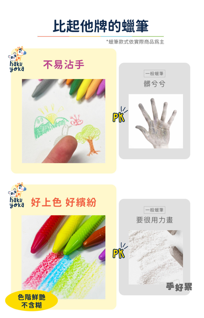 Haku Yoka 的每一個產品都經過精心設計,以誘發創意的造型,及安全配方,讓孩子們能盡情創作,父母安心無慮。為了塗鴉期孩子所設計的安全蠟筆,以天然蜂蠟製成、色彩鮮艷、堅固耐玩不沾手、易清洗、無毒無臭,獨特造型好抓握。