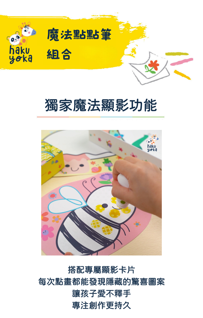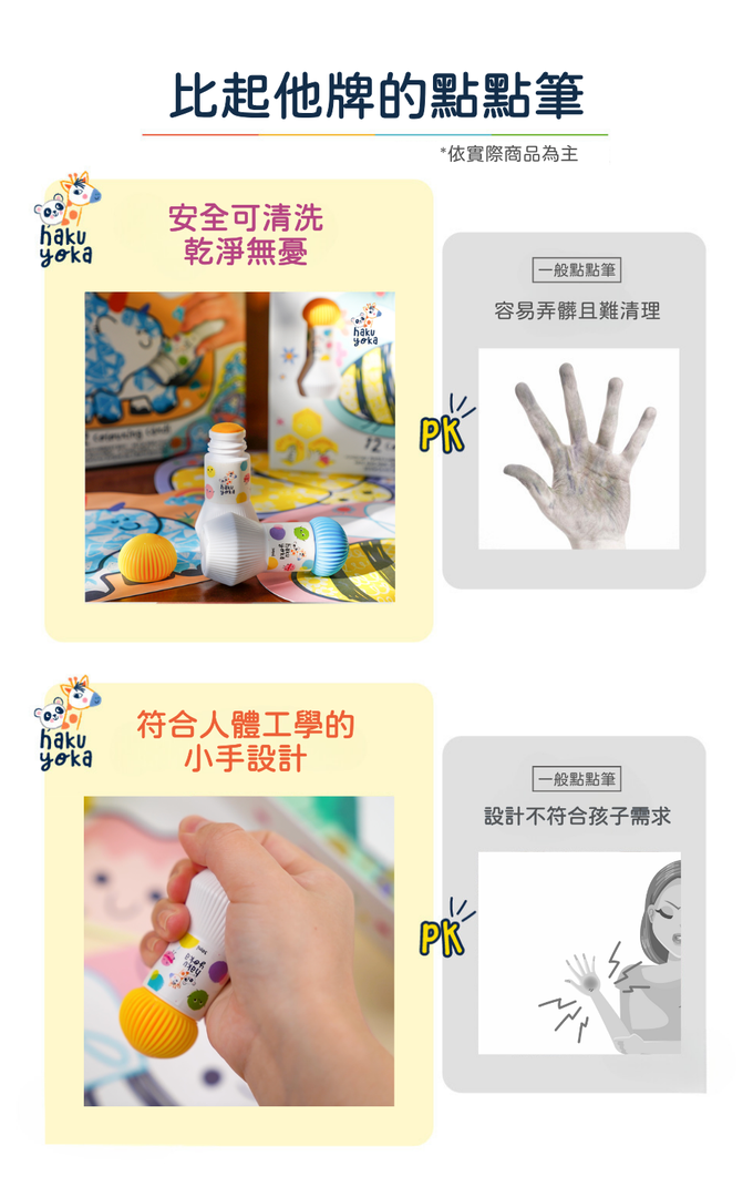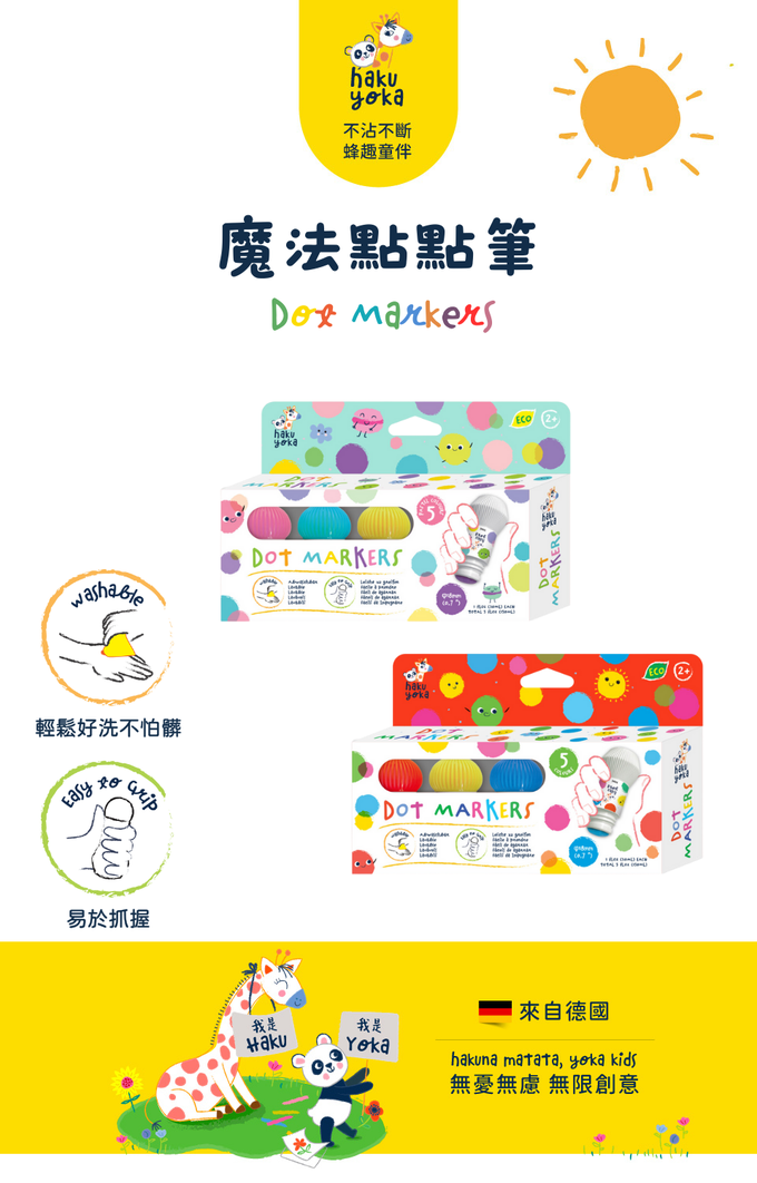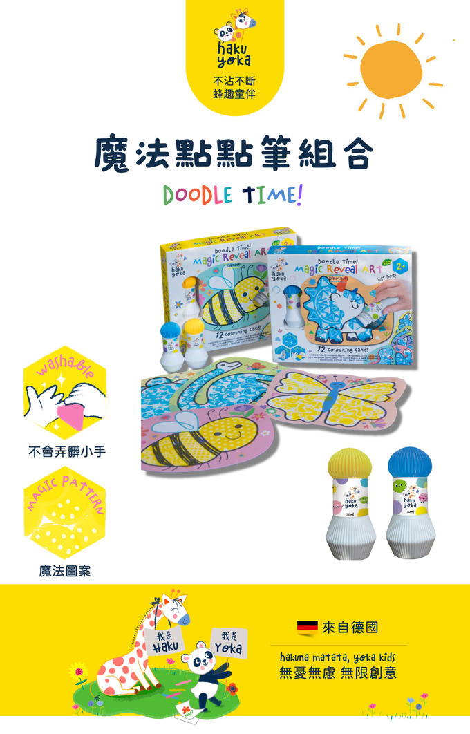 Haku Yoka 的每一個產品都經過精心設計,以誘發創意的造型,及安全配方,讓孩子們能盡情創作,父母安心無慮。為了塗鴉期孩子所設計的安全蠟筆,以天然蜂蠟製成、色彩鮮艷、堅固耐玩不沾手、易清洗、無毒無臭,獨特造型好抓握。