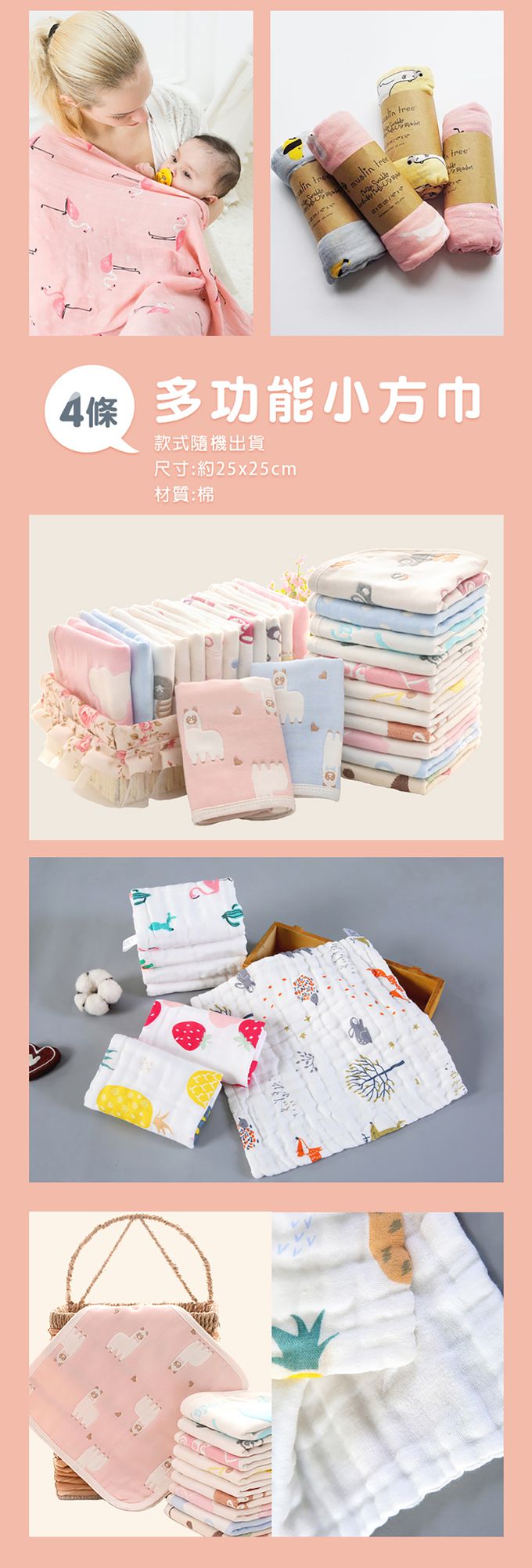 8.多功能方巾,不論是當洗澡巾、餵奶巾、小手帕、口水巾、拍嗝巾,都適用。