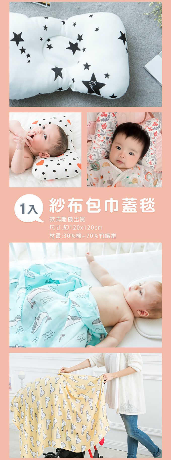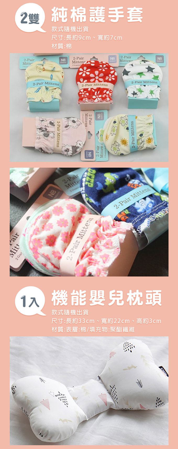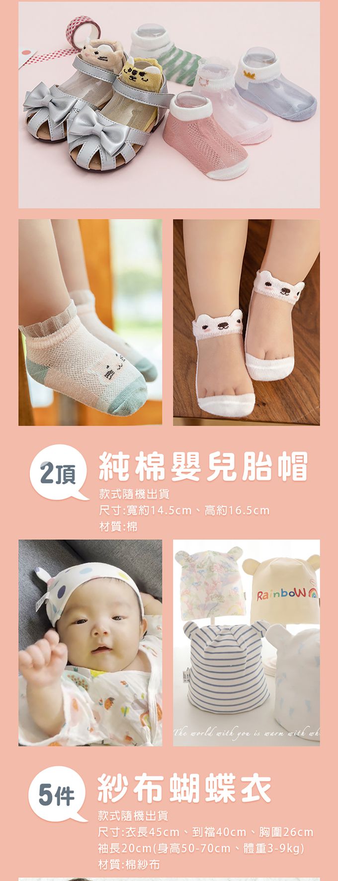 春夏童襪*5雙 / 新生兒機能枕*1入 / 胎帽*2頂 / 竹纖維紗布包巾*1入 / 紗布蝴蝶衣*5入 / 多功能方巾*4條 / 新生兒手套*2雙/ 加贈"帆布提袋"