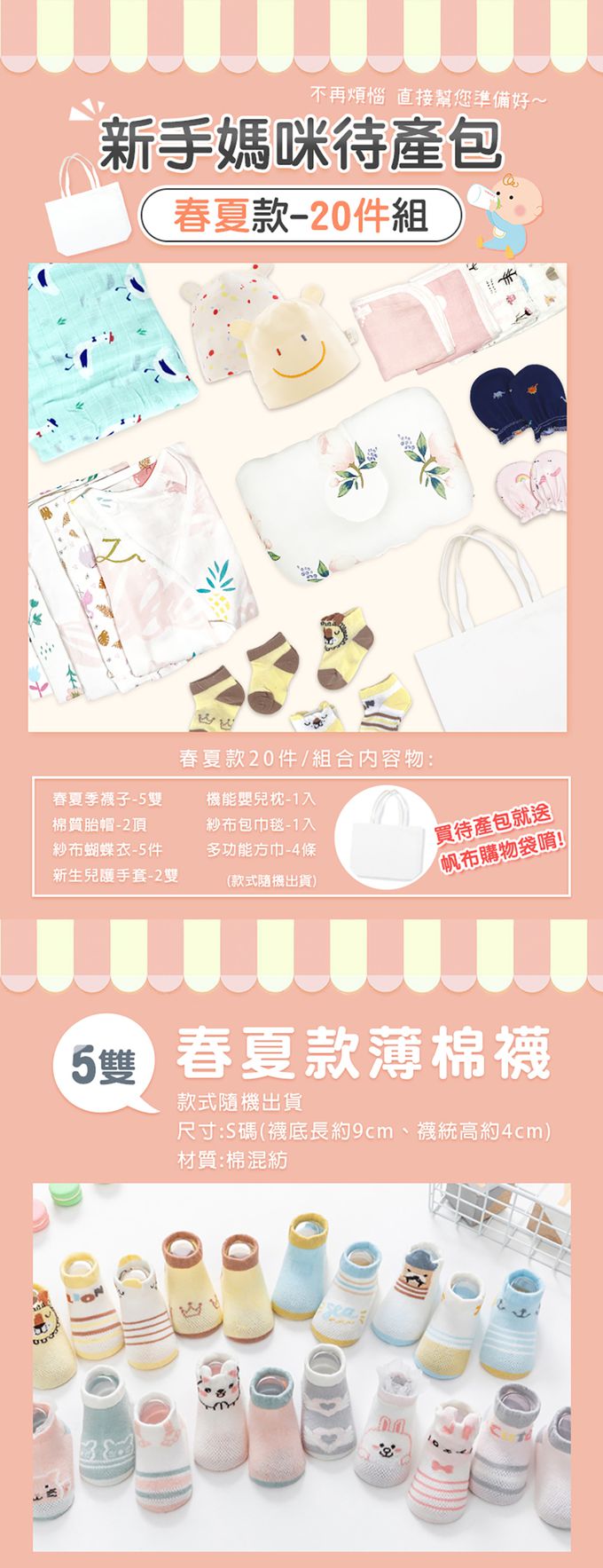 • 品名:媽咪待產包 春夏新生兒用品(20件超值組+素色帆布袋)