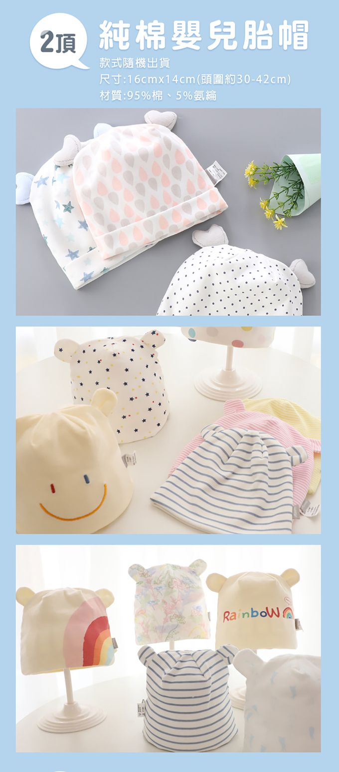 3.棉質胎帽,新生兒剛出生天庭蓋尚未長好閉合,需要一頂棉質帽子保護頭皮,更添可愛。
