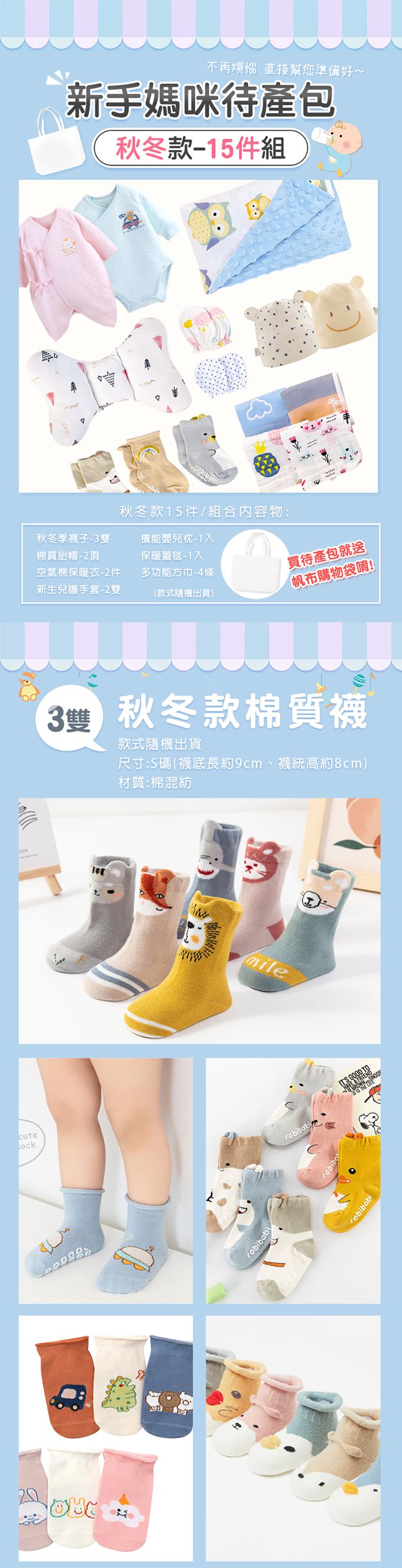 秋冬童襪*3雙 / 新生兒機能枕*1入 / 胎帽*2頂 / 短毛絨泡泡蓋毯*1入 / 空氣棉保暖衣*2入 / 多功能方巾*4條 / 新生兒手套*2雙/加贈"帆布提袋"