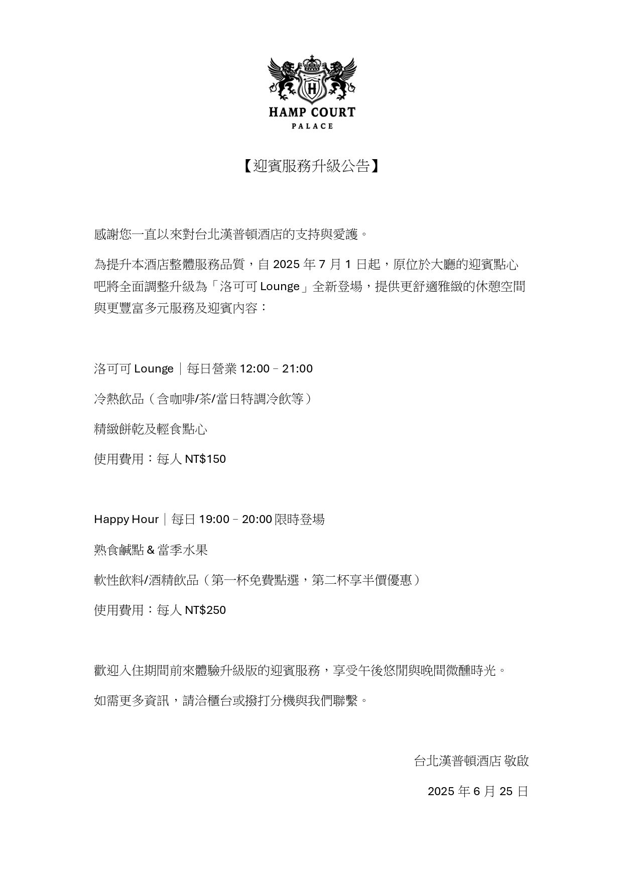2025/7/1起,原位於大廳的迎賓點心吧全面升級為「洛可可Lounge」全新登場,每日營業時間12:00-21:00,收費標準:每人$150;Happy Hour 每日提供時間19:00-20:00,收費標準:每人$250。(餐點請依現場供應為準)