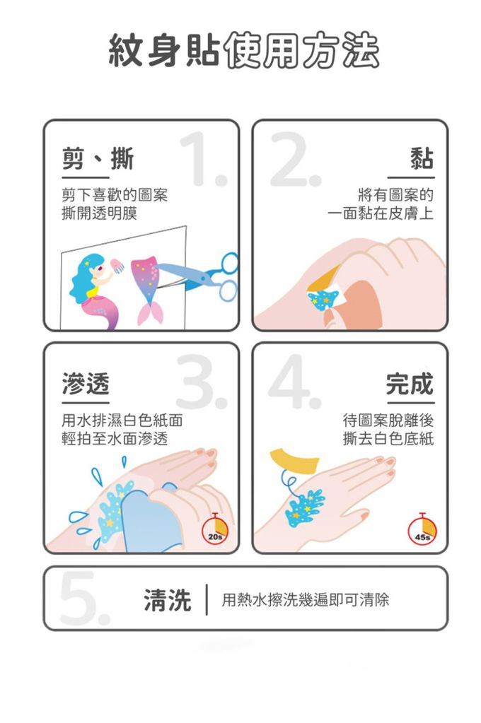 ※ 使用方式:美甲貼紙-小心從貼紙邊緣撕下 (避免過度用力撕破) 並粘貼在指甲或其他物品上裝飾;使用肥皂水或酒精擦拭移除貼紙。紋身轉印貼紙-將貼紙及其紙張/塑膠片一起剪下,移除塑膠片後,將貼紙面朝肌膚放上定位,以濕毛巾將整個貼紙沾溼 20 秒,移除紙張並允許45秒時間風乾;使用嬰兒油或酒精棉片擦拭移除紋身貼紙。