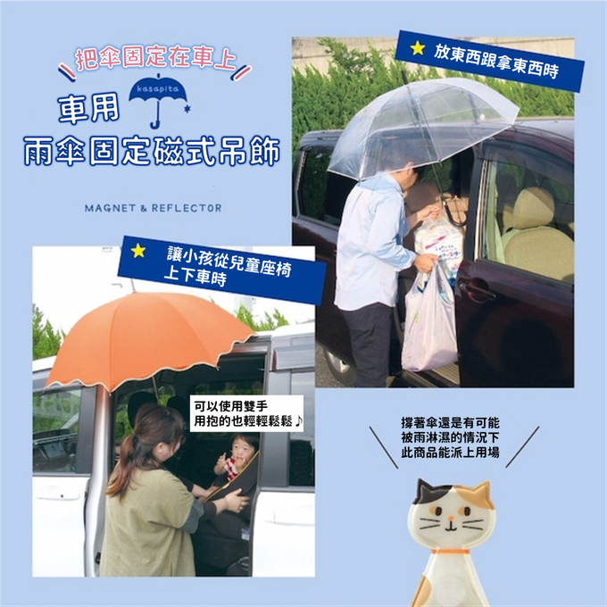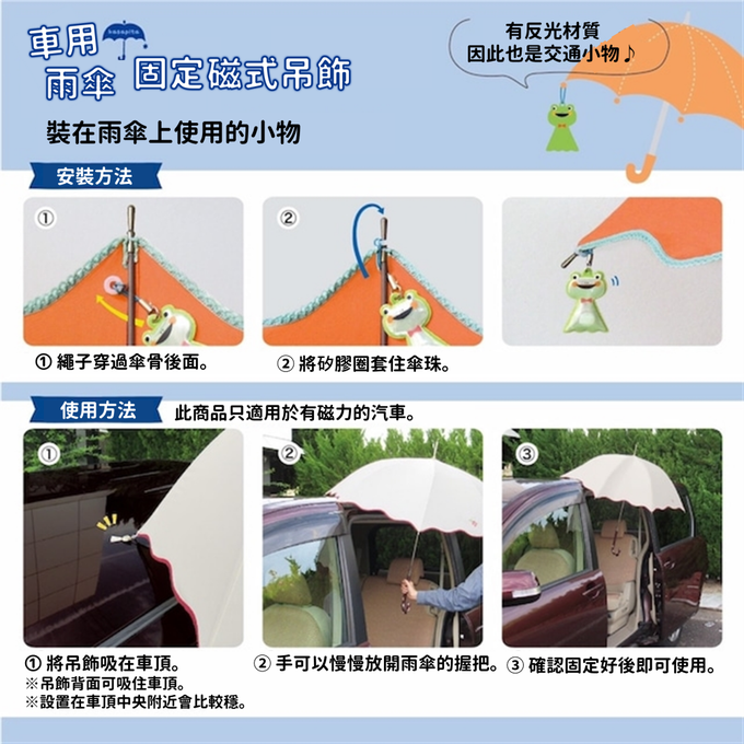 將有磁鐵的吊飾安裝到雨傘後,將吊飾放置在車頂上,即可輕鬆固定雨傘,解放雙手。