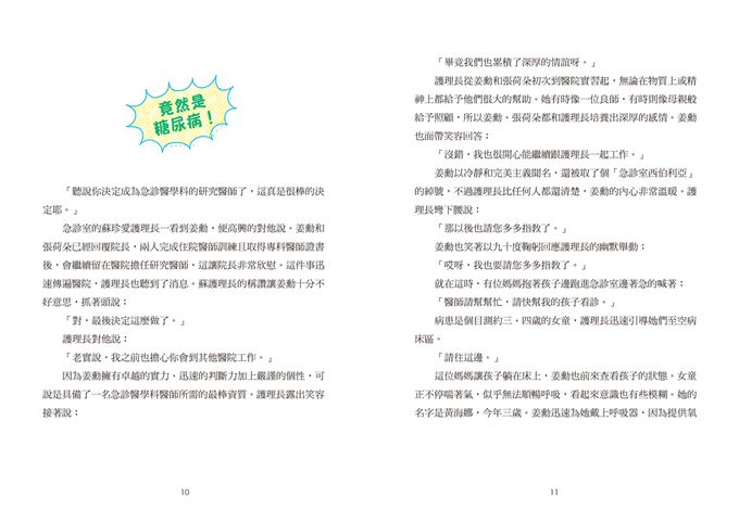 將急診室日常搬到書本之中,從驚險緊張的急救場景、觸動人心的醫病互動到青澀甜蜜的青春戀曲,劇情豐富且人物設定立體飽滿,呈現如韓劇般有笑有淚的醫院職人故事,既有知識深度亦不乏趣味性。