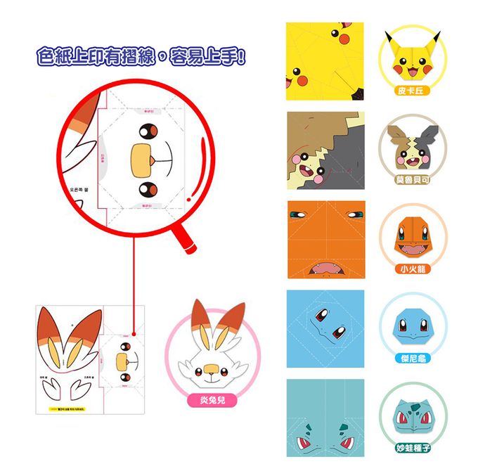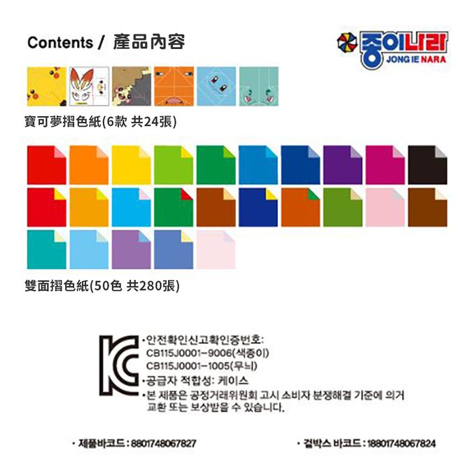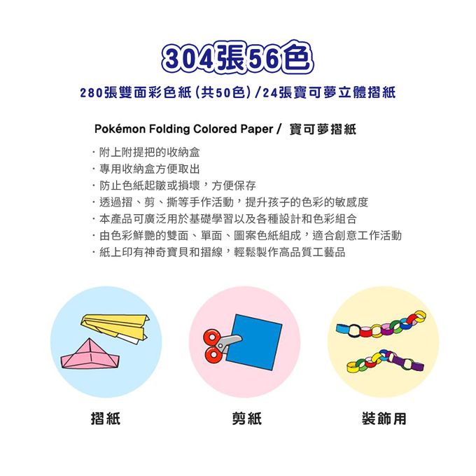 內容物:50色雙面色紙共280張、寶可夢摺紙6款共24張(合計304張)